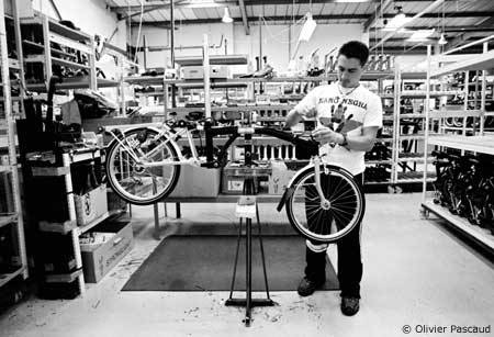 Im August 2002 hat der Fotograf aus Paris das Brompton-Werk in London besucht und einige Bilder mitgebracht. Diese Räder werden tatsächlich in England gebaut und die Stimmung scheint nicht schlecht zu sein. Der Mann links auf dem vierten Foto ist übrigens Andrew Ritchie, der Erfinder des Brompton.