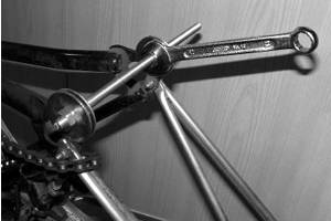 Anmerkung von Rainer Zenz: Beim Aufweiten sollte man den vorderen Teil des Hinterbaus im Bereich der Querstrebe mit einer Zwinge oder im Schraubstock mithilfe untergelegter Holzstücke o.ä. so fixieren, daß die Lötstellen der Querstrebe nicht auf Zug belastet werden.